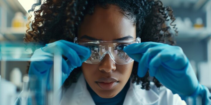One mixed-race scientist with curly hair using a microscope in a lab with safety goggles and gloves. Young woman conducting forensic study and curative experiments