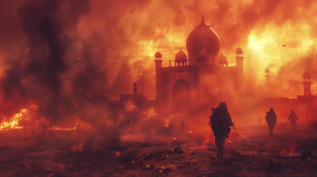 Inferno of War: A once-majestic mosque stands defiant amidst a raging inferno, silhouetted against a sky ablaze with destruction, as soldiers navigate the fiery hellscape, a poignant depiction of conf