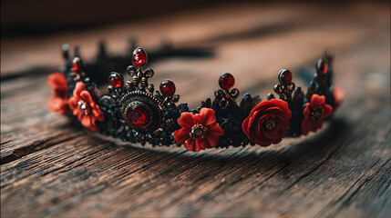 una corona hecha a mano artesanal conf lores rojas y negras hermosas para adorno en la cabeza femenino