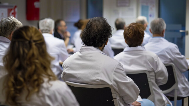 Medical conference, study group, seminar, training male and female medical staff in scrubs, medical workers, doctors