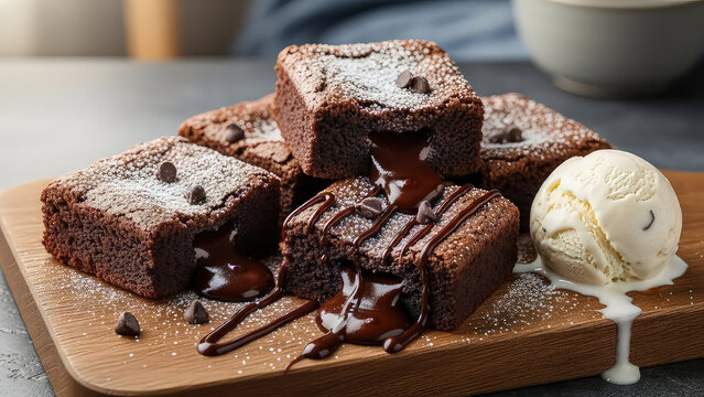 Molten Chocolate Brownies With Vanilla Ice Cream On Wooden Board