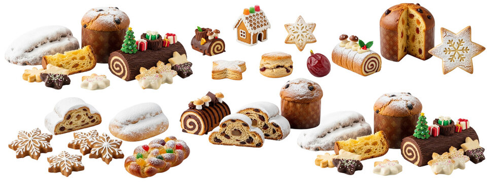 Assorted Christmas Desserts & Pastries – Yule Logs, Stollen & Gingerbread on White Background