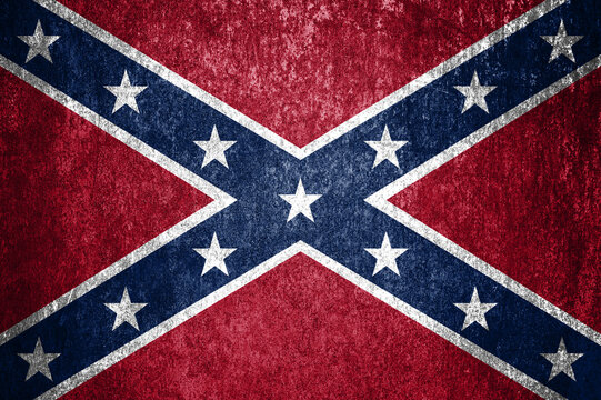 Close-up of grunge Confederate States of America flag. Dirty Confederate States of America flag on a metal surface.