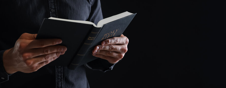 Priest with Holy Bible on black background, closeup. Space for text