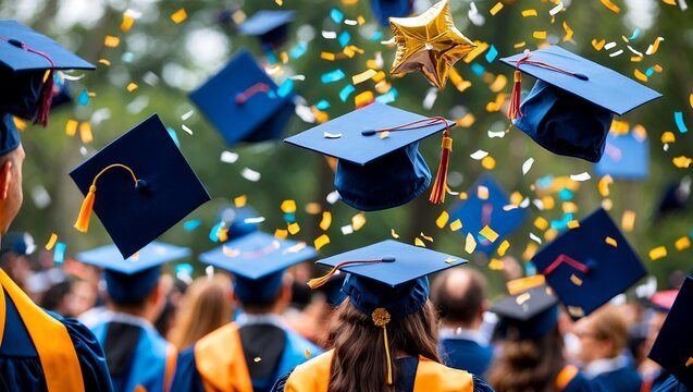 Blue graduation caps tossed in celebratory air, gold confetti falling