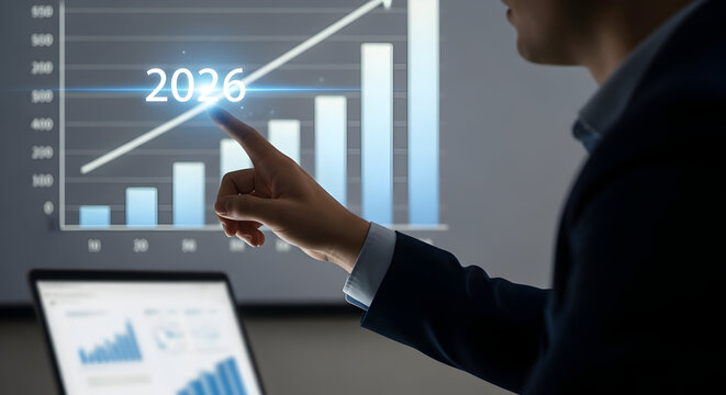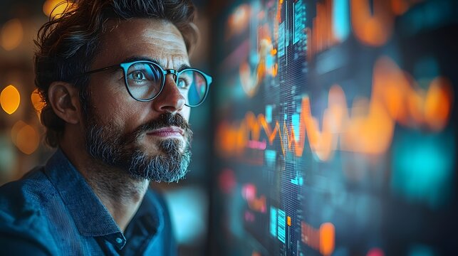 confident businessman analyzing financial data and stock market trends on a digital display.