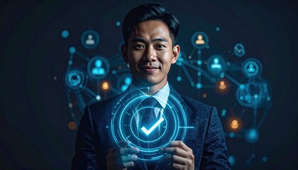 Man in suit holds glowing checkmark graphic