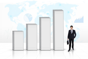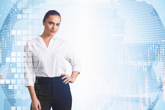 Businesswoman with pen in hand thinking, earth globe and candlesticks changes