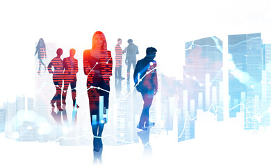 Teamwork in financial company, stock market hologram and cityscape silhouette