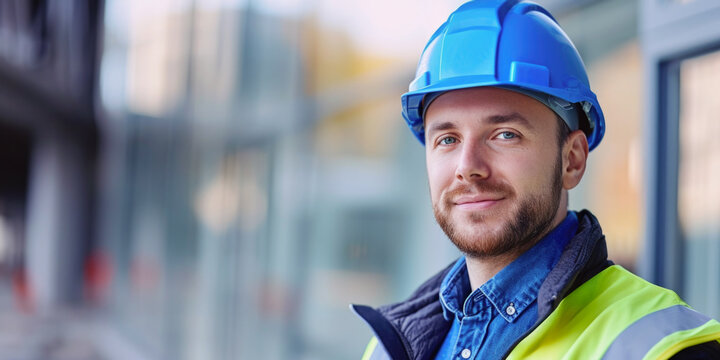Smiling construction worker in safety gear at a construction site oversees progress