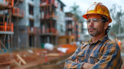 A confident construction worker in a plaid shirt, safety helmet, and goggles stands with arms crossed, overseeing building progress on an active construction site