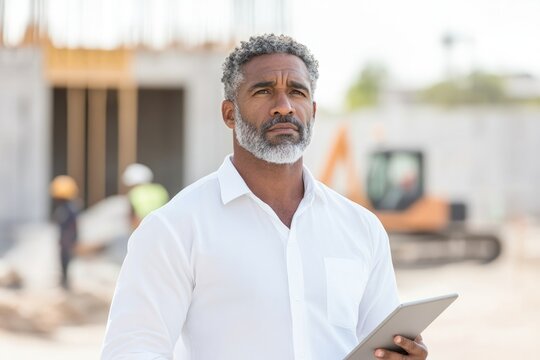 Confident man in white shirt oversees construction site, holding