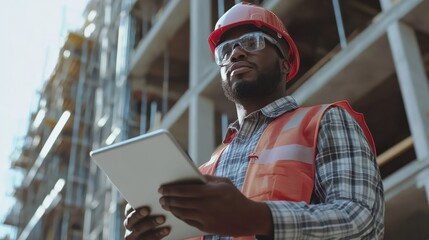 Construction worker checking tablet for project management