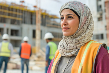 Confident female engineer in hijab overseeing construction site progress
