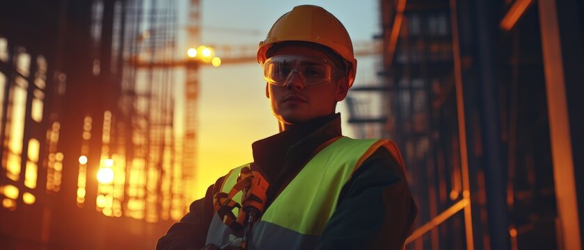 Construction Worker in Safety Gear at Sunset: Confident Professional Overseeing Building Site Development with Cranes in Background