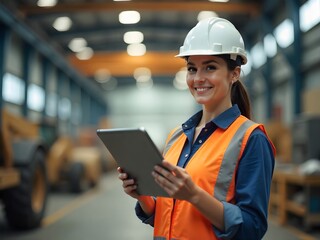 Confident female engineer in hard hat holding tablet in industrial setting