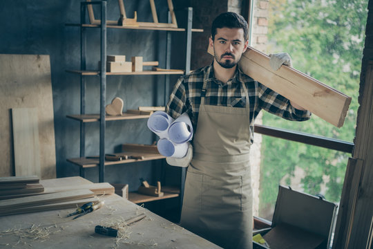 Photo of serious confident man holding wooden block on his shoulder and rolls of blueprints with the other hand standing near desktop with filings on