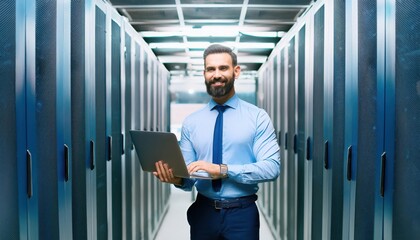 A bearded IT specialist stands confidently in a server room, holding a laptop, and surrounded by rows of server racks