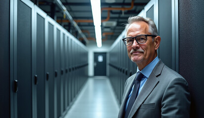 A confident man in a blue suit stands with a clipboard in hand, surrounded by tall server racks illuminated by blue lights in a modern data center