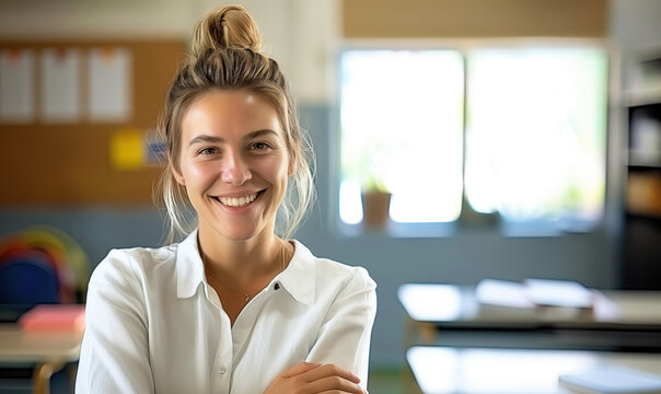 In a classroom, a presented with blond hair is smiling and has her arms crossed. She seems happy and engaged in the event, exuding a sense of fun and professionalism. back to school concept