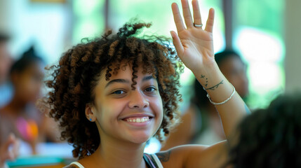 Smiling student raising hand in classroom, engaging in learning..