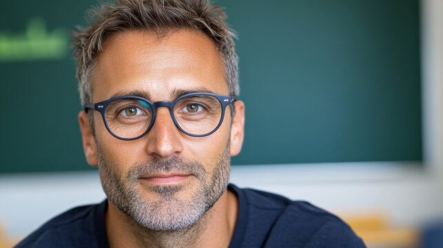 Educator With Glasses Smiling Confidently in a Classroom Setting During a Bright Daytime Session