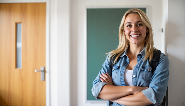 Smiling young woman with crossed arms in a classroom setting for blogs, educational websites, student resources, teaching materials, and personal development presentations