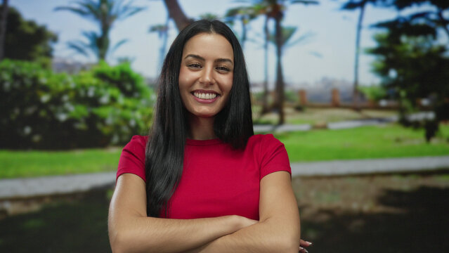 Woman smiling in vibrant red shirt at sunny park with lush greenery and palm trees in the background, exuding joy and relaxation.