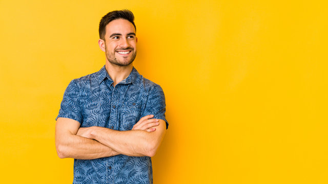 Young caucasian man isolated on yellow bakground smiling confident with crossed arms.