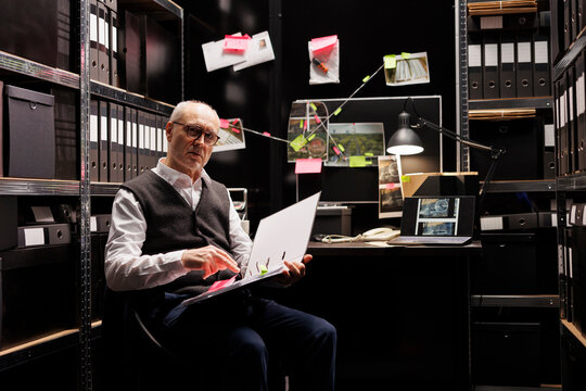 Elderly criminal investigator analyzing crime scene report, checking criminology files. Fbi agent working late at night at suspect profile in arhive room, planning confidential federal investigation