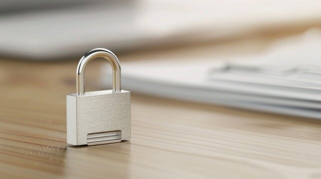 Secure padlock on wooden desk with blurred documents in background