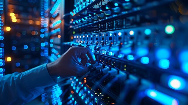 Technician in blue shirt configuring server rack in data center with colleagues in background. LED lights illuminating server room creating modern technological ambiance