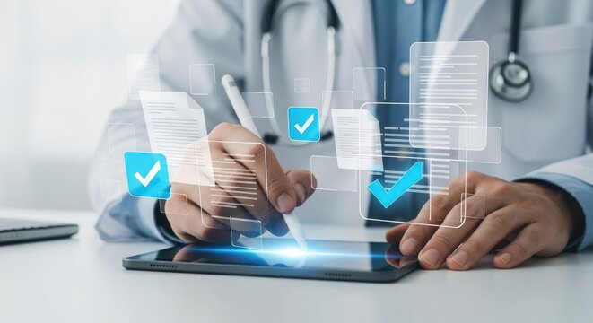 Doctor Using Digital Tablet with Checkmarks and Documents