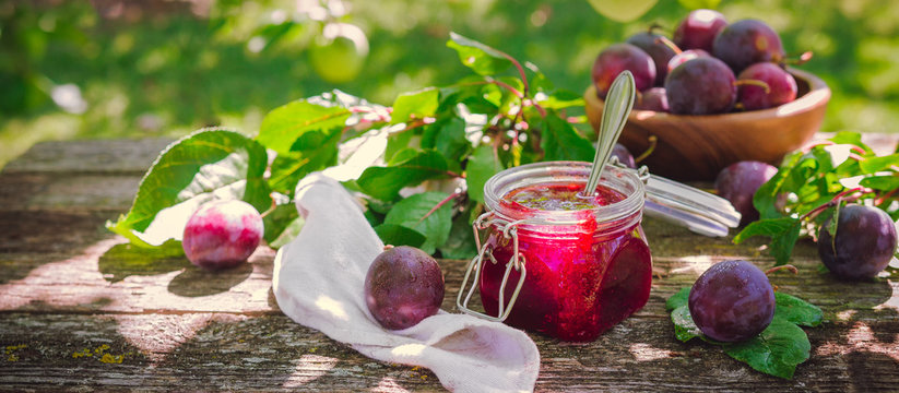 Glass jar with plum jam confiture and ripe plum berries in a basket on a wooden vintage table in the garden with a copy space, the idea of home canning and organic ecological bio nutrition