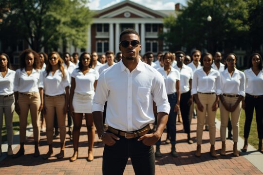 A man standing in front of a group of people. AI image. Imaginary club, fraternity group.