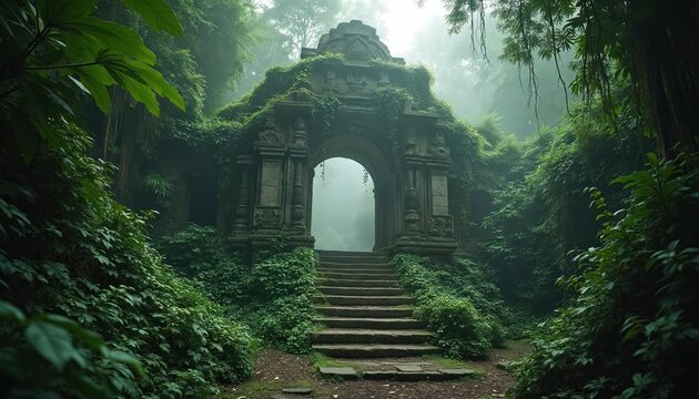 Ancient stone archway overgrown with vines and moss leads up stone steps into misty jungle. Rich green forest surrounds forgotten ruins, hinting at lost civilization and mysterious pathways beyond.