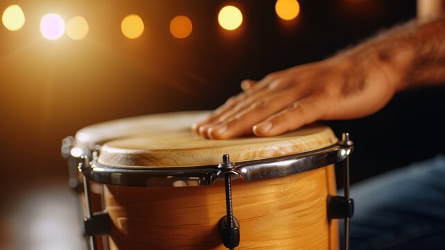 A drummer's hand on a conga drum, ready to create vibrant rhythms against a blurred stage backdrop.