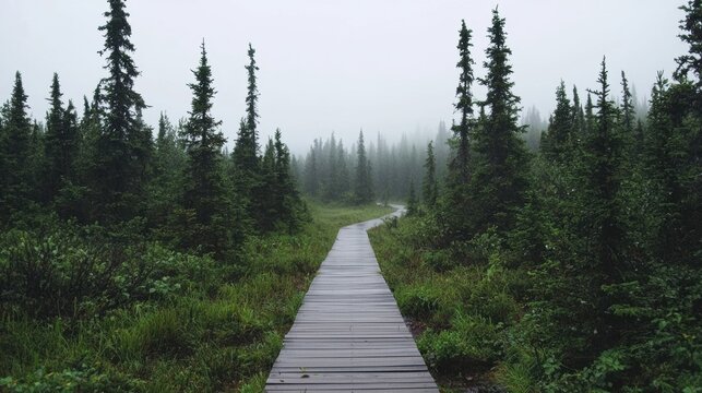 A wooden boardwalk winds through a dense forest, disappearing into the misty distance.