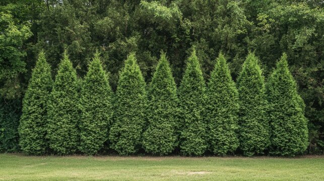 Row of tall green conifer trees creating a natural hedge with clear copy space for text in grassy landscape.