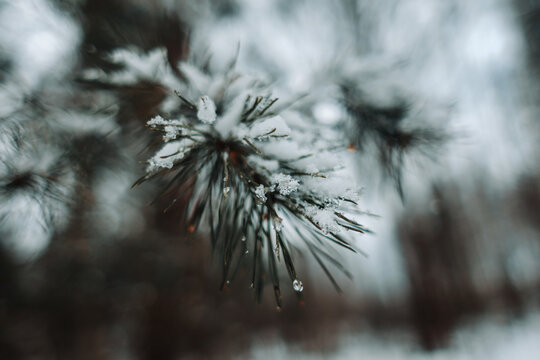 Frozen fir needle with snow closeup dramatic winter pine macro branch