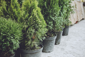 Christmas fir pine tree growing in a nursery near forest. Close up shot, shallow depth of field, no people
