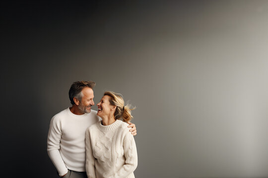 couple hétérosexuel quinqua, 50 ans environ, habillé avec des pulls blancs, qui se tiennent dans les bras et rigolent en se regardant. Fond gris avec espace négatif pour texte copyspace