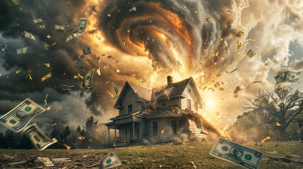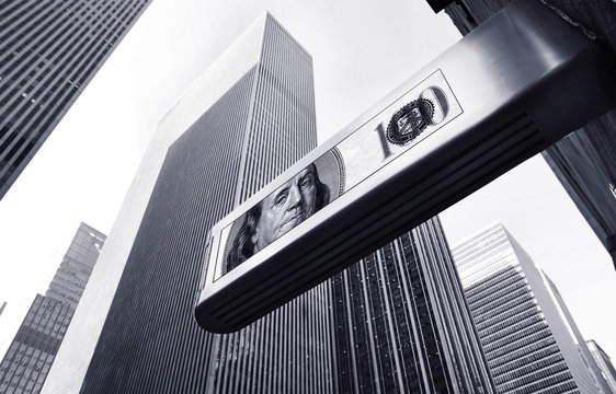 Benjamin Franklin face on USD dollar banknote with red decreasing stock market graph chart for symbol of economic recession crisis concept.
