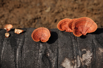 Fomitopsis pinicola, is a stem decay fungus common on softwood and hardwood trees. Its conk (fruit body) is known as the red-belted conk. Several lined caps on a rotten tree trunk seen from above.