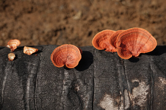 Vibrant orange bracket fungi growing on a decaying log. Detailed wood conk mushroom texture in a forest setting. Natural decomposition and woodland biodiversity