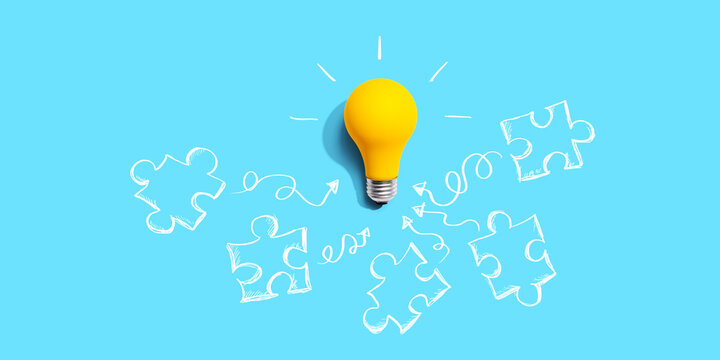 Jigsaw puzzle with a yellow light bulb - flat lay