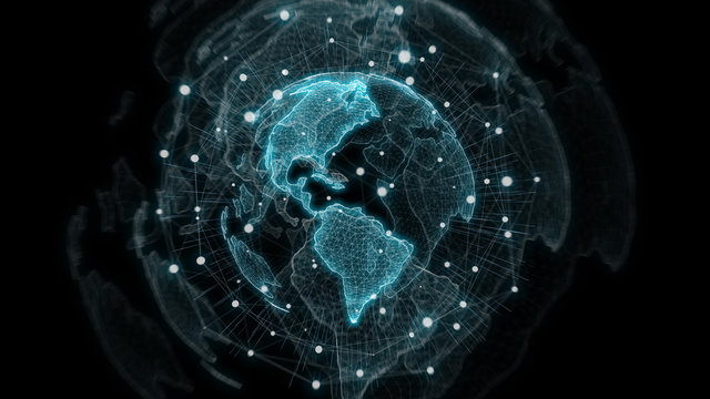 Digital wireframe globe portrays global connectivity network