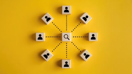 Wooden blocks with person icons connected by strings on a yellow surface, symbolizing a network