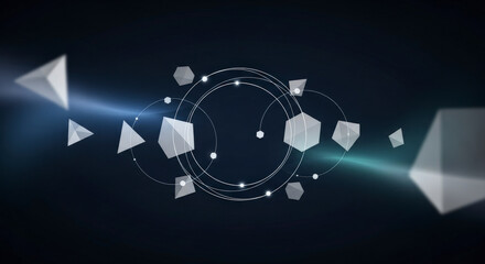 Abstract network of geometric shapes connected by glowing lines on a dark blue background, representing data, technology, and futuristic concepts