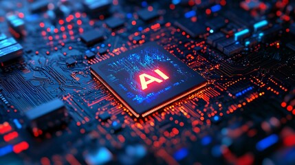 Close-up of a microprocessor chip with AI label connected to intricate circuits